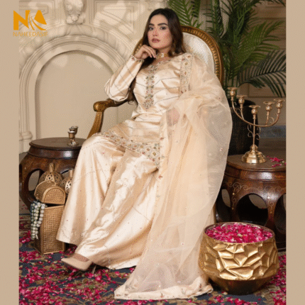 Rendered in cool shade of Pink Faryal, this outfit features hand embroided neckline around with intricate hand embellishment on the shirt also embroided lace with handmade zardosi work on the border and organza sleeves with handmade motifs embellished dupatta on hand zardosi work laces also laces on the sharara this classic silhouette is ideal for your upcoming festivities.